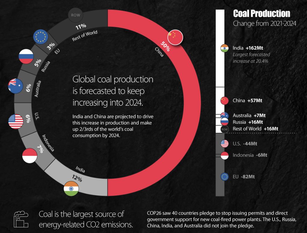 전세계의 2021 - 2024(F)까지 석탄 생산량은 지속해서 증가할 것으로 전망되고 있습니다. 해당 자료에 따르면, 중국과 인도는 세계 석탄 생산의 거의 60%를 차지하며, 연간 생산량이 총 2억 톤 이상 증가할 것으로 예상됩니다. 두 나라는 자국 내 에너지 수요를 충족시키기 위해 선택한 방법이죠. 중국은 2026년부터 석탄 사용량을 줄이기 시작할 예정이지만, 에너지 수요를 충족시키기 위해 43개의 새로운 석탄 화력 발전소를 건설할 계획입니다. 추가적인 생산은 석탄 수입 의존도를 줄이기 위해 추진됩니다.