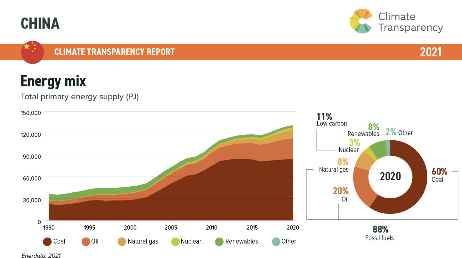 클라이메이트트랜스패런시에 따르면, 중국은 전체 에너지 소비의 약 60%를 석탄으로 공급받고 있으며, 20% 오일, 8% 천연가스의 비율로 에너지 생산을 만들고 있습니다. 즉, 88%의 에너지 생산은 화석연료에 의존하고 있는 셈입니다.