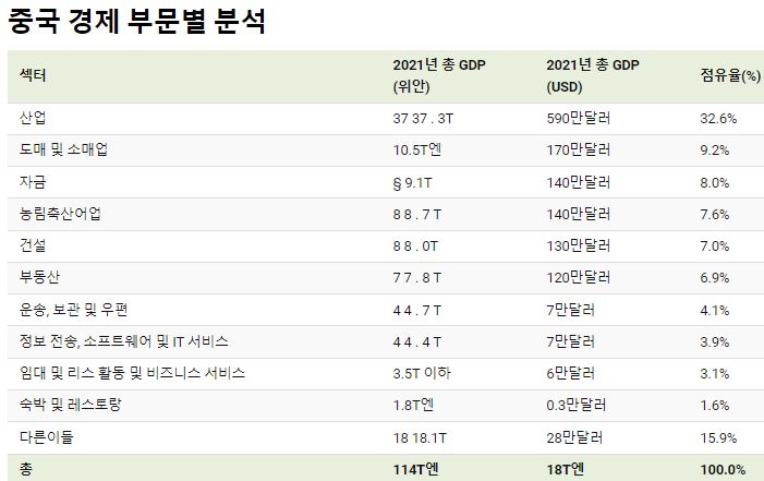 이외에도 눈에 띄는 분야는 약 7%와 6.9% 의 기여비율을 가지고 있는 건설과 부동산 섹터입니다. 이는 중국이 높은 GDP 성장률을 유지하기 위해 지속적인 부동산 (아파트 등)의 인프라를 건축하는 것으로 여겨집니다. 중국의 여러 도시들은 급속한 도시화와 인프라 개발에 힘입어 건설 붐을 경험했습니다.